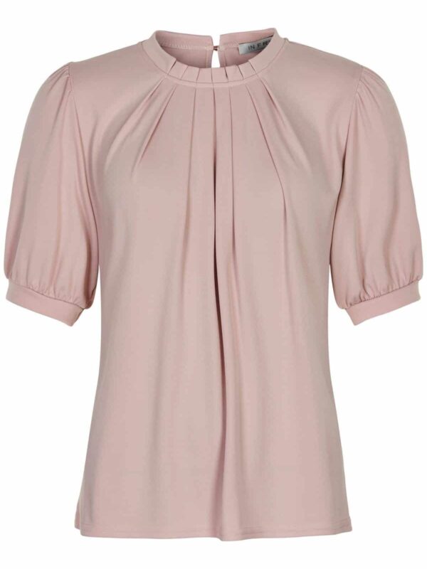 Blusen har læg langs halskant, som giver fald ned foran på blusen.