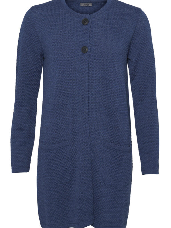 Rund hals og langt ærme med 4 knapper og 2 lommer foran.